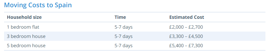 Moving Costs to Spain